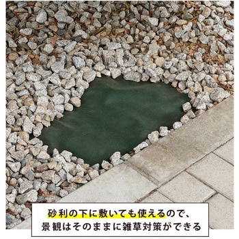 耐候剤入りで高耐久・高透水の不織布製のシート。日光を遮断し光合成を妨げ雑草が生えるのを防ぐ。