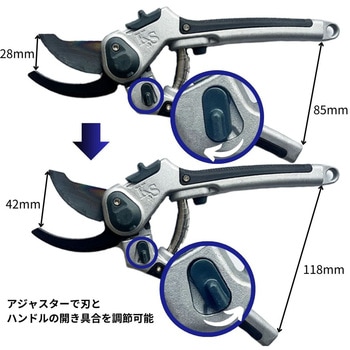 航空宇宙分野で使用される独自のコーティング技術で作られた並外れた切れ味の炭素鋼ブレード製剪定鋏。手のサイズに合わせた開閉幅の調整が可能です。一体型ワイヤーカッターとストリングカッターが付属し、最大径24mmまでの切断ができます。枯れたバラ、低木、生木の剪定にも最適です。