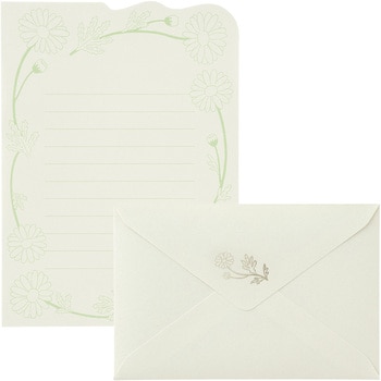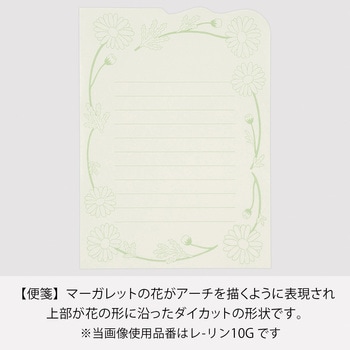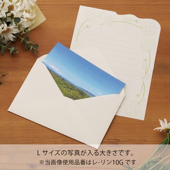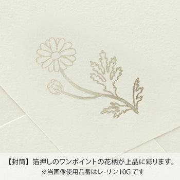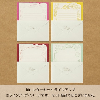 「一輪の花が想いを彩る」という意味のRinレターセット。便箋は花がアーチを描くように表現され、穏やかで凛とした佇まいのあるデザインです。封筒は箔押しの花柄がワンポイントの上品なデザインです。Lサイズの写真が入る大きさです。様々なお礼や、お祝いの贈り物に添える手紙としてお使いいただけます。