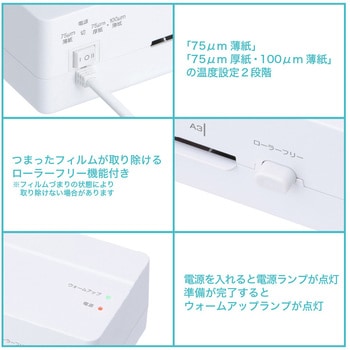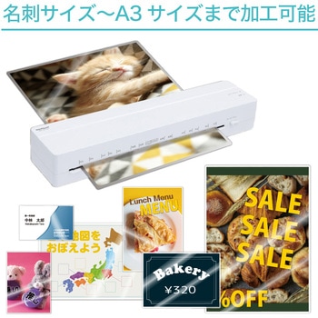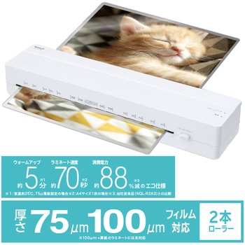 付属品クリーニングペーパー(1枚)、名刺・写真サイズ用キャリアシート(1枚)電圧(V)100(50/60Hz)消費電力160W(50/60Hz)本体質量(kg)1.14本体寸法W438×D105×H71mmウォームアップ時間約5分(室温約25℃、75μm薄紙設定の場合)最大ラミネート厚さ(mm)0.5(フィルムと原稿を合わせた厚さ)保証期間6ヶ月ラミネート速度(mm/分)約250/300(50/60Hz)温度設定75μm薄紙約107℃ / 75μm厚紙・100μm薄紙約112℃(50/60Hz)最大ラミネート幅(mm)330(最小は名刺サイズ)対応フィルム厚さ(μm)75(薄紙・厚紙)、100(薄紙)内容量1台