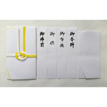 黄白水引で短冊4枚入り(御佛前・御供・御香料・御布施)。中袋付き。