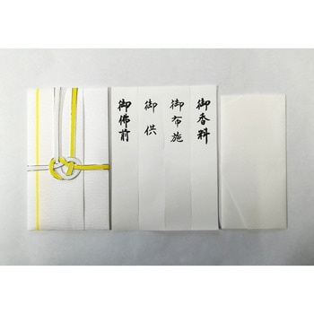 本体に檀紙を使った耳銀黄白水引。短冊4枚入り(御佛前・御供・御香料・御布施)。中袋付き。
