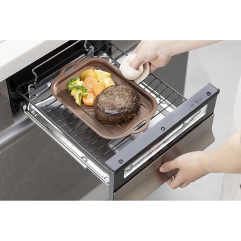 食材の解凍から、グリル調理までこれ1枚!グリル、オーブン、トースターで使用でき、そのまま食卓へ。さらにフッ素加工で汚れが落ちやすく、時短家事が叶います。食洗機対応。