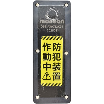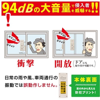 本体裏面には「防犯装置作動中」の表示があり、窓の外側から視認でき、防犯抑止効果が高まります。
