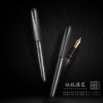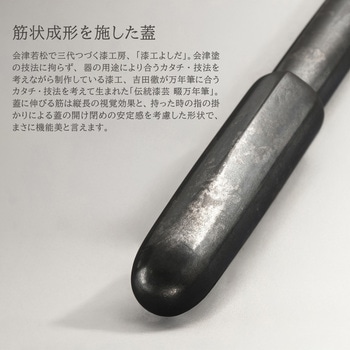 会津若松で三代つづく漆工房「漆工よしだ」による特別な技法「筋状成形(すじじょうせいけい)」を施した「畷」シリーズ黒銀箔は、一般的なシルバー製品にも見られる銀と硫黄成分が反応する「硫化」によって硫化銀へと変化し、黒に近い色調になります。1 枚の箔でも部位によって黒さにムラがあり、箔自体に自然なまだら模様が生まれます。素材は純度99.99% の銀箔を使用しています。