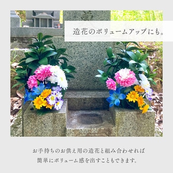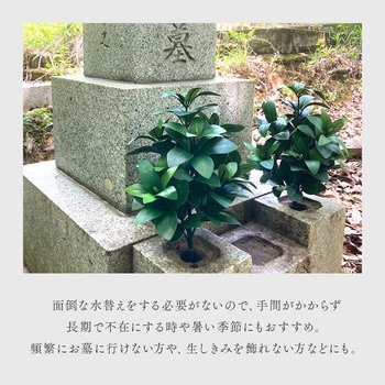枯れる心配がない、お墓・仏壇のお供え用造花です。しきみを模して作られており、水やり不要でお手入れも簡単。嫌な臭いも発生しません。枯れる心配がなく、美しい色合いを長期間保てます。旅行や出張などで長期不在する時や、なかなかお墓参りに行けないという時にも。茎にワイヤーが入っているので、バランスやボリュームを調整して、美しく飾ることができます。お手持ちの造花に加えて、ボリューム感を出したいときにも便利です。2束入り。