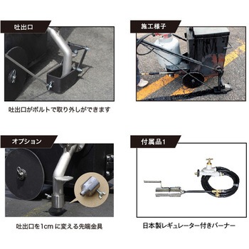 高い施工能力1回の作業で約130m、1日で約250mのクラック補修が可能ムダなく注入吐出しストッパー・吐出量調整機構により、材料の出し過ぎや溢れを防止シンプルな操作性直火タイプの加熱方式で、設備の設置・撤収がスムーズ幅広い対応力オプションの先端金具(吐出口1cm)を使用すれば、目地への注入も可能