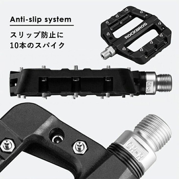 幅広設計で安定感が高く、滑り止めピンが足をしっかりホールドしてくれるので、ペダリングパワーをしっかり伝達。