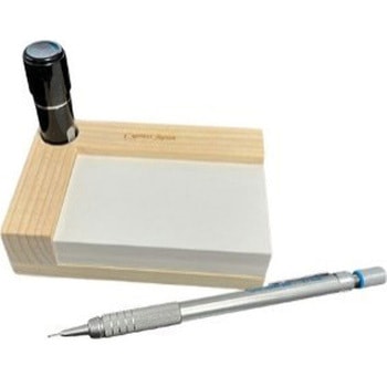 日本産ヒノキ無垢材から作ったデスクメモパッドです。左の穴には印鑑を入れる事ができます。メモのサイズは名刺やカードと同じサイズなので、メモが無くなれば名刺やカード置きとして使う事ができます。
