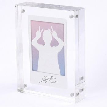 丈夫なアクリル製の為、机上のインテリアにぴったり。マグネットで挟んで固定する為、写真の差し替えが簡単です。厚みがあるのでスタンドなしで自立します。