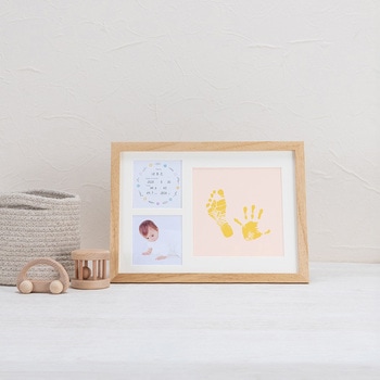 写真と一緒に手形・足形を残せるフォトフレームです。身近な人や大切な人へ贈る記念品として、また大切な記念日をカタチとして残すのに最適です。赤ちゃんの手足をインクで汚さずに、手形足形が残せます。失敗してもやり直しが可能です。安全性の高い『日本製インク』の発色液を採用しています。お名前や誕生の記録を書き込むことができる記録スペース付き。<ご使用上の注意>お子様の手足のサイズによっては発色紙に手形足形が入り切らない場合があります。窓寸法をご確認ください。
