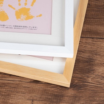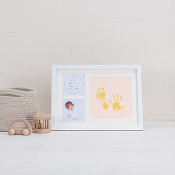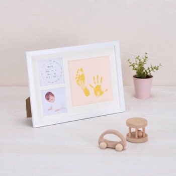 写真と一緒に手形・足形を残せるフォトフレームです。身近な人や大切な人へ贈る記念品として、また大切な記念日をカタチとして残すのに最適です。赤ちゃんの手足をインクで汚さずに、手形足形が残せます。失敗してもやり直しが可能です。安全性の高い『日本製インク』の発色液を採用しています。お名前や誕生の記録を書き込むことができる記録スペース付き。<ご使用上の注意>お子様の手足のサイズによっては発色紙に手形足形が入り切らない場合があります。窓寸法をご確認ください。