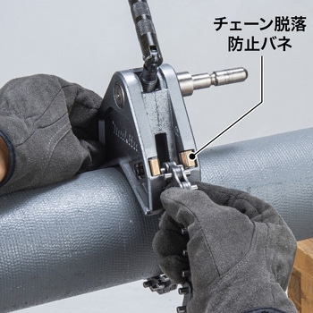 チェーン脱落防止バネにより、材料へ簡単に固定可能。楽々、チェーンバイス固定