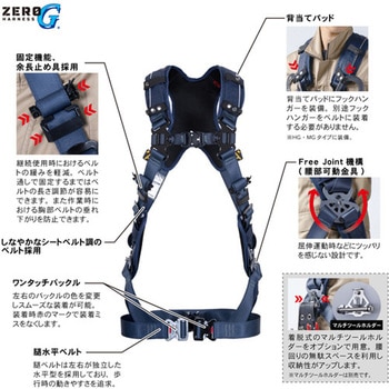 装着ストレスZERO:Free Joint機構により、屈伸作業などにツッパリ感を感じません。しなやかなシートベルト調の採用により、装着性が向上。ベルトの緩みZERO:固定機能付ベルト通しの採用により、継続使用時におけるベルトの緩みを軽減。余長止め具を採用し、作業時におけるベルトの垂れ下がりを防止。無駄スペースZERO:別売のマルチツールホルダーを使用することで腰回りのスペースを利用。別売の胴ベルトが装着可能です。