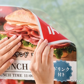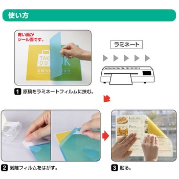 片面がシールになった、ステッカータイプのラミネートフィルムです。原稿を挟んでラミネートし、剥離フィルムをはがせば、テープ不要ですぐに貼れます。のり面のグリッド(格子状の凹凸)加工で窓ガラスなどに貼る際に空気が抜けやすく、気泡やシワを軽減します。