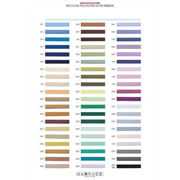 再生ポリエステルの糸を使用したポリエステル片面サテンリボンです。9サイズ/36色展開です。