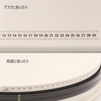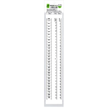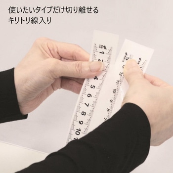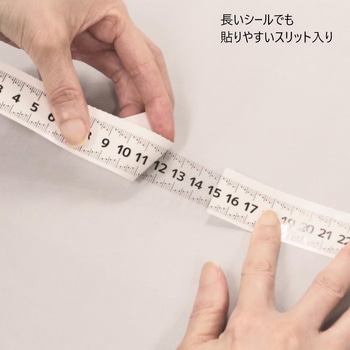 身の回りの物に気軽に貼れる「ものさしシール」です。目盛の種類は細幅、広幅の端面左基点、細幅の中央基点の3種類です。貼って剥がせる&強粘着シールです。本体は透明で、目盛は黒です。1mm単位の目盛が見やすい階段状目盛です。偶数飛びで数値を把握できる2mm点目盛です。読み取り数値を間違えにくい連続追数字です。