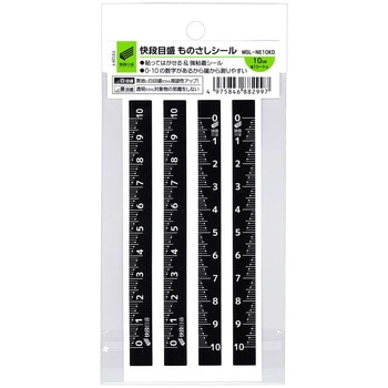 身の回りの物に気軽に貼れる「ものさしシール」です。0~10までの総数字です。貼って剥がせる&強粘着シールです。本体が透明で目盛が黒、本体が黒で目盛は白と2色あります。1mm単位の目盛が見やすい階段状目盛です。偶数飛びで数値を把握できる2mm点目盛です。読み取り数値を間違えにくい連続追数字です。