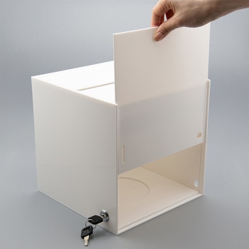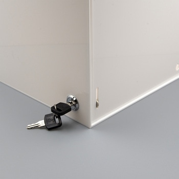 これ一台で応募箱にも抽選箱にもなる2WAYボックスです。2種類の天板付きで、不使用分は内部底面に収納可能です。側面パネルをスライドして外すことができ、中身の回収も簡単に行えます。側面に鍵がついており、中身の紛失や盗難が防げます。本体盗難防止用ワイヤーが取り付け可能です。