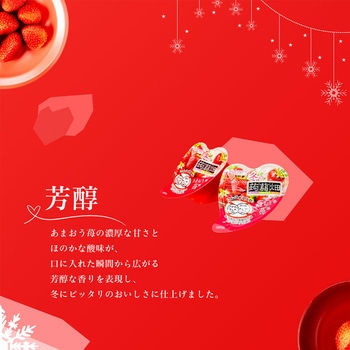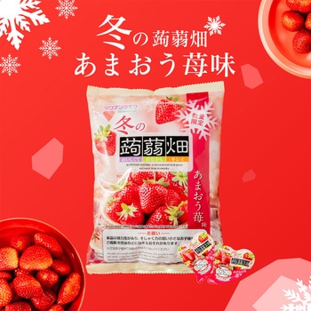 こんにゃく(グルコマンナン)を果汁で味付けした、フルーツこんにゃくです。果物では味わえないこんにゃく独特の食感は、さらに美味しさを引き立てます。 あまおう苺の濃厚な甘さとほのかな酸味、口に入れた瞬間から広がる芳醇な香りを表現し、冬にピッタリのおいしさに仕上げました。