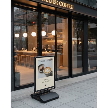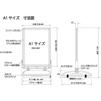 ローリングベースにブラックタンクが新登場。よりシックでスタイリッシュな印象になりました。風速30メートルまで耐えられる風に強い両面用屋外スタンド看板です。両面にポスターをセットして使用します。フレーム開閉式なのでポスターのセット交換が簡単に行えます。キャスターも付いているので移動も簡単です。防水パックシート付なのでポスターの防水加工は不要です。ベース部に水を入れてお使いください。ロングセラー商品、公園、大学、テーマパークなどあらゆるシーンで活躍しています。