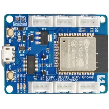 Espressif Systemsの無線通信モジュール(Wi-Fi + Bluetooth) ESP-WROOM-32と、GROVEコネクタ、USB-シリアル変換IC FT231XS、3.3Vレギュレータ、リセットスイッチ、動作モード切り替え用スイッチが一体となった開発ボードです。