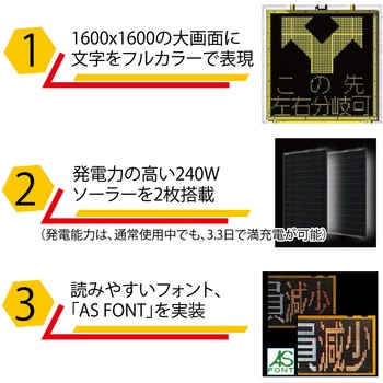 ソーラーの発電力で1600サイズの大画面を実現しました。発電機の搭載も可能で電力供給が不安定な環境でも安心です。発電力の高い240Wソーラーパネルを2枚搭載しています。読みやすいフォント「AS FONT」を実装、視認性も抜群です。大画面にフルカラーで文字を表現できます。