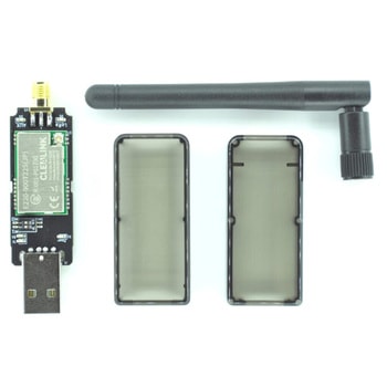 クレアリンクテクノロジー社製のLoRa通信モジュールE220-900T22S(JP)を搭載したLoRa無線USBドングルです。LoRaは、通信速度が1.7kbps~62.5kbpsと低速ですが、見通し通信距離が1km以上と長距離の通信が可能な無線通信規格です。技術基準適合証明を取得済みで、日本国内で使用できます。パソコンに接続してLoRa通信モジュールのON/OFFの制御や、動作状態を取得することができます。SMAアンテナ(TX915-JK-11)とケースが付属しています。