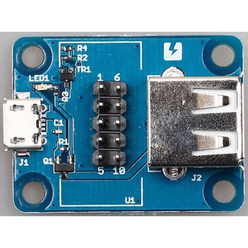 MESH GPIOタグを使ってUSB電源のON/OFFを制御するモジュールです。USBによる給電で動作するデバイスの電源をON/OFFできます。MESH GPIOタグのVOUT端子とUSBの5V出力が連動します。出力がONになると基板上の赤色LEDが点灯します。このモジュールの他に、microUSBケーブル、USB電源が必要です。USBの通信機能は使用できません。
