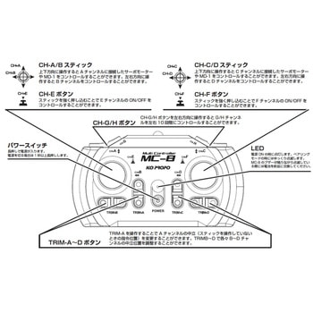 セット内容送信機:マルチコントローラーMC-8 ×1、受信機:マルチレシーバーMR-8 ×1、ESC:MD-2(ツインモーターミキシングESC) ×1、MD-1(ニュートラルブレーキ仕様) ×2、電池ボックス+スイッチ:電源ユニット ×1寸法(mm)【送信機 MC-8】150.0×84.5×61.0、【受信機 MR-8】27.0×28.0×15.0質量(g)【送信機 MC-8】145.5(電池含まず)、【受信機 MR-8】7.0電源【送信機 MC-8】単4乾電池、単4型充電式電池×4本(別売)/【受信機 MR-8】3.0~6.6Vチャンネル数【送信機 MC-8】8(スティック操作4系統+スイッチ操作4系統)/【受信機 MR-8】8使用電源【受信機 MR-8】乾電池、または充電式電池 (Ni-MH 3~5s、Li-Fe 1~2s、Li-Po 1s)消費電流(mA)【送信機 MC-8】50以下/【受信機 MR-8】40以下(受信動作時)使用時間【送信機 MC-8】連続17時間以上使用可能(条件により異なります)ケーブル【受信機 MR-8】3.3V受信周波数【受信機 MR-8】2.4GHz電波到達距離(m)【送信機 MC-8】片翼50 ※環境や受信アンテナ状態により増減します送信周波数(GHz)【送信機 MC-8】2.4内容量1セット