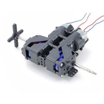 高い精度と耐久性により、ロボットコンテストへの出場マシンに多く使用されているテクニクラフトシリーズのギヤボックスです。5速ツインギヤボックスHEは、左右独立型のギヤボックスを連結しています。ギヤの組み替えとドライブシャフトの位置変更で6.1:1、15.6:1、40.2:1、103.3:1、265.6:1の5種のギヤ比が選べます。左右のギヤボックスの連結や分離は、はめ込み式なので手軽です。