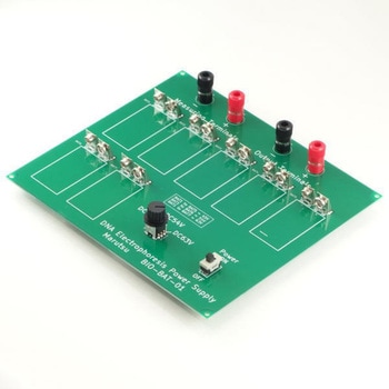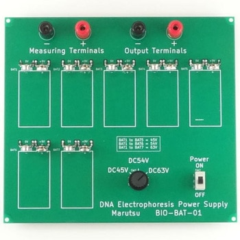9Vのアルカリ角形電池を5個直列(DC45V)にして使用するDNA電気泳動電源です。オプションで合計7個まで拡張することができます。6個の場合はDC54V、7個の場合はDC63Vになります。