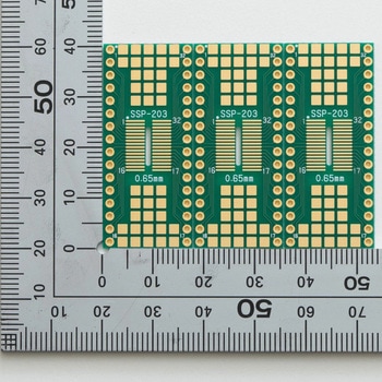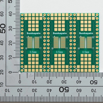 SOPパッケージのICを2.54mmピッチに変換する基板32ピンのSSOP(0.65mmピッチ)やVSOP(0.5mmピッチ)のICを2.54mmピッチ(600mil幅)に変換する変換基板です。基板厚さが1.0mmの薄型仕様です。3枚セットです。