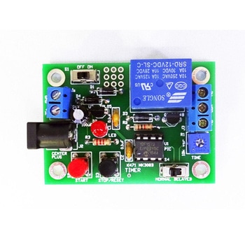 LED/電灯/ブザーなどを時間指定でオン/オフできるタイマーキット電源を入れてスタートスイッチを押せば、設定した時間でリレーに接続された電子機器をオン(またはオフ)できるタイマーキットです。いつでも停止させられるストップスイッチも付いています。使用しているリレーは125VAC/10A対応なので、様々な機器をオン(またはオフ)できます。設定時間は約2秒から約500秒で、ボリュームを回すだけで簡単に変更できます。このキットは、はんだ付けが必要です。