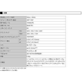 仕様トランス・タップ:70V:30W、15W、7.5W、3.8W、100V:30W、15W、7.5W付属品シールドプレート×1、シールドプレート用ねじ×4、防水ケーブルグランド×2、ジェル入りワイヤーナットコネクター×2、セキュリティーねじ×1、セキュリティーねじ穴キャップ×1、セキュリティーねじ用スクリュードライバー×1材質エンクロージャー:ポリエチレン、緑寸法(mm)287×427(除突起部)、(ドライバー構成)LF:5.25インチ(133mm)、HF:0.75インチ(19mm)、ケーブル:Φ4.0~9.0 ※断面が円形のケーブルに限る質量(kg)5.4角度(°)カバレージ:360×160(水平×垂直)感度86dB SPL(1W、1m)入力先バラケーブル周波数55Hz~18kHz(レンジ(-10dB))インピーダンス公称:8Ω音圧レベル(dB)最大:105dB SPL許容入力(W)160/80(プログラム/ピンク)内容量1個