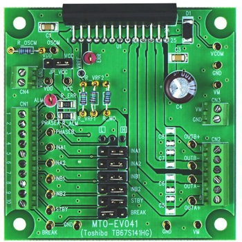 TB67S141HGは、東芝デバイス&ストレージ社製のPWMチョッパ型2相ユニポーラ駆動、PHASE制御方式のステッピングモータドライバです。BiCDプロセスを採用し、モータ駆動電圧45V 、最大定格電流3.0Aを実現しています。本評価ボードにはICを評価するために必要な部品を実装しており、PWM定電流駆動により、2相、1-2相、W1-2相の各励磁駆動をすぐに試すことができます。ステッピングモータの低騒音+低振動を、本評価ボードを使って体感してください。