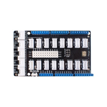 Groveシステムに対応したさまざまなセンサやアクチュエータを接続できるArduino Mega1280/2560用のベースシールドです。Groveシステムは、配線を簡素化するため2mmピッチの4ピンコネクタ(信号1、信号2、VCC、GND)を採用したインターフェースです。信号1と信号2は、Arduino Megaの同じピンを共有しています。中央にはPWM出力端子が並べられ、サーボモーターなどが使いやすくなっています。