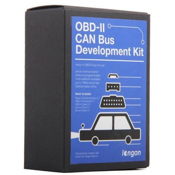 このキットには、シリアルCAN-BUSモジュールとOBD-IIコネクタが含まれており、このキットを使用して自動車のOBD-IIインターフェースと接続ができます。このキットを使用すると、自動車から簡単にデータを取得することができます。Arduinoに基づくチュートリアルがメーカーサイトに用意されています。