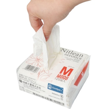 手首部分から1枚ずつ取り出しができ手袋の無駄な取り出しを軽減できます。コンパクトなパッケージで従来品の約43%の容積縮小を実現。※メーカー調べ。