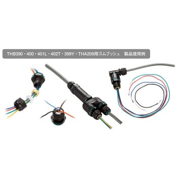 THB390・400・401L・402T・399Y・THA209用ゴムブッシュTHBシリーズ・THAシリーズ専用のゴムブッシュになります。径の細いケーブルを使用したい時や、複数の線を取り出したい時にご使用ください。6000087LFは、Φ7.0mm以下の線を使用するとき、ゴムブッシュのはみ出しを防ぎ防水性を安定させることが出来ます。必要に応じてご利用ください。THB400-○-17シリーズには使用できません。