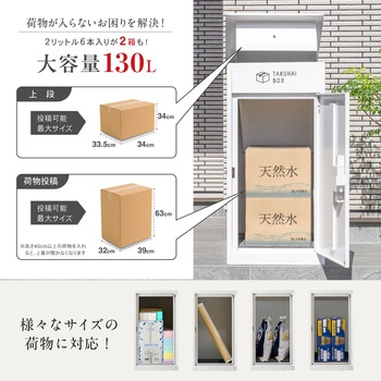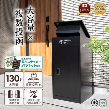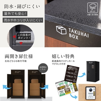 【これからは荷物があなたを待つ時代へ!新生活仕様がスタート!】本製品 TAKUHAI BOXは、今までの常識を覆し、デザイン性と機能性を兼ね備えた最新モデルの宅配ボックスです。従来の宅配ボックスは投函回数が一回に限られたもの、100V電源や乾電池を必要とするものや、取り付けが複雑など、使いづらさや耐久性などの問題がありました。しかし本製品では、長期間研究を重ね、これまでの宅配ボックスの課題点の解決だけでなく、お客様の「こんなのが欲しかった!」というニーズを全て取り入れた仕様となっています。本体を玄関に設置するだけで使い始められるという手軽さもうれしいところ!また、どんな玄関でもマッチするオシャレなカラーをご用意しましたのでDIY感覚で設置を楽しめます。