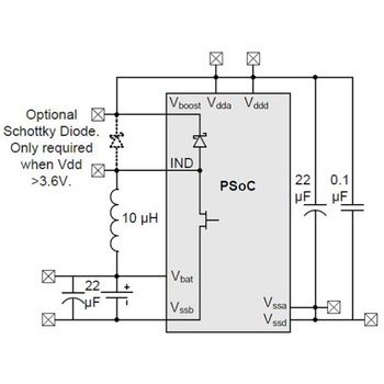 MPSOC5-MB基板のブースト・コンバータ機能を利用するためのオプションパーツセットです。ブースト・コンバータ機能を利用することで、MB基板を電池で動作させることができるようになります。最小0.5Vからの駆動が可能で、マイコン/アナログ回路/デジタル回路の各ブロックに1.8~5Vまで昇圧して最大75mA供給可能です。是非とも電池駆動、低電圧電源環境下でのPSoC5LPの活用にお役立てください。