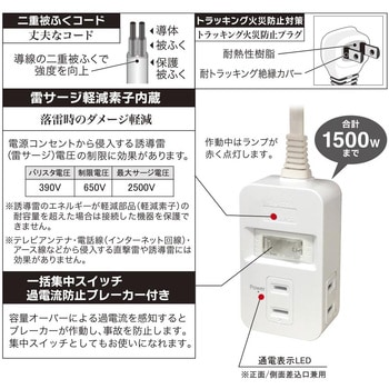 特許技術で異常過熱をしっかり検知、通電火災からしっかり守る(特許技術採用 第5853076号) 差し込み口の温度が異常高温になると、発煙に至る前に自動的に通電を遮断し、火災事故を未然に防ぎます。 一括集中スイッチ 過電流防止ブレーカー付き 雷サージ軽減素子内蔵 二重被ふくコード。導線の二重被ふくで強度を向上 トラッキング火災防止プラグ 通電表示LED(正面/側面差込口兼用)