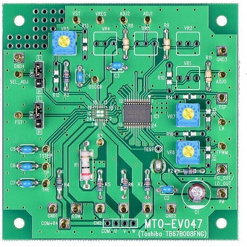 TB67B008FNGは、東芝デバイス&ストレージ社製のPWMチョッパ方式3相ブラシレスモータ用のセンサレスドライバです。速度制御入力でPWMのデューティを可変し、回転数を制御することができます。BiCDプロセスを採用し、出力耐圧25V/3.0A、最大動作電圧22Vを実現しています。TB67B008FNGを使った3相ブラシレスDCモータの制御性を、本評価ボードを使用して体感してください。