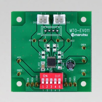 本評価ボードではICを評価するための部品を実装しており、2つのブラシDCモータをダイレクトPWM駆動にて制御することが可能です。また、ステッピングモータ接続用のコネクタを実装することで、ステッピングモータの制御も可能になっています。