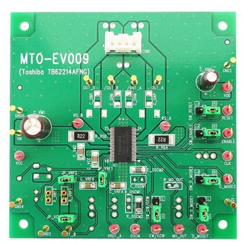 TB62214Aは、東芝デバイス&ストレージ社製のPWMチョッパ型2相バイポーラ駆動、CLK-IN制御方式のステッピングモータドライバです。BiCDプロセスを採用し、出力耐圧が40V 、最大定格電流が2.0Aを実現しています。本評価ボードにはICを評価するために必要な部品を実装しており、PWM定電流駆動による、2相、1-2相、W1-2相の各励磁駆動をすぐ試すことができます。ステッピングモータの低騒音+低振動を、本評価ボードを使って体感してください。
