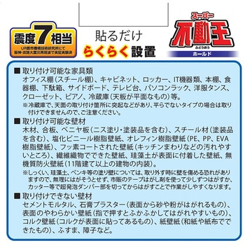 大型家具を移動させずにそのまま設置できる、便利な転倒防止器具です。衝撃をしっかり吸収する超発泡ダンパーを採用し、地震などの振動を緩和。家具と天井の間に設置するだけで、揺れからの転倒をしっかり防止します。工具不要で簡単に取り付け・取り外しができ、壁や床を傷つけずにしっかり固定できます。震度7相当の実験でも効果が確認されています。耐荷重150kgまで対応し、高さ215cmの家具にも設置可能な防災グッズです。地震対策や防災準備の基本アイテムとしてご家庭やオフィスで活躍します。【取り付け可能な家具類】本棚、食器棚、オフィス棚(スチール棚)、下駄箱、キャビネット、サイドボード、テレビ台、パソコンラック、洋服タンス、クローゼット、冷蔵庫(天板が平面なもの)など【取り付け可能な壁材】木材、合板、ベニヤ板(ニス塗り、塗装品を含む)、スチール材(塗装品を含む)、塩化ビニル樹脂壁紙、オレフィン樹脂壁紙(PE、PP、EVA樹脂壁紙)、フッ素コートされた壁紙(キッチンまわりなどの汚れやすいところ)、繊維織物でできた壁紙、珪藻土が表面に付着した壁紙、無機質防火壁紙(11階建て以上の建物の内装)