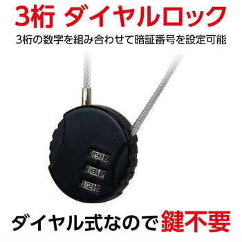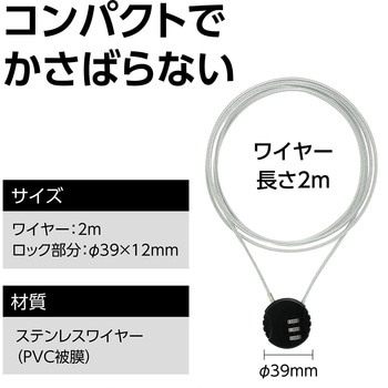 ワイヤーとダイヤル錠が一体化!多用途に使える2mステンレスワイヤー錠!3桁のダイヤル式で鍵が不要なワイヤーロックです。ワイヤーとダイヤル錠が一体化しているため、鍵を紛失する心配がありません。ステンレスワイヤーはPVC被膜付きでサビや傷に強い仕様です。宅配ボックスや自転車、旅行時の荷物管理など幅広く活躍します。セキュリティ対策や持ち物の盗難防止に便利な防犯アイテムです。