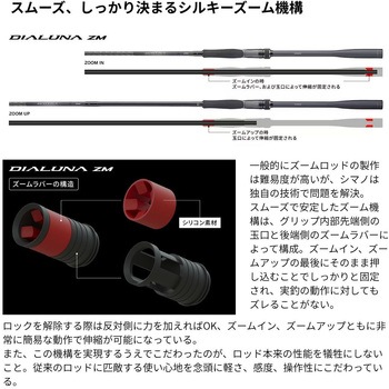 ショアキャスティングロッドとしての高い基本性能に、レングスを変えられるズーム機構をプラスした「ディアルーナZM」。ショアキャスティングゲームは港湾、河川や堤防など、環境が多種多様であるだけでなく、潮汐によって流れや水深が刻一刻と変化し、ありとあらゆるシチュエーションが存在する。そのようなアングラーを悩ませる条件を1本のロッドで対応するために、独創的ズームロッドを開発。ズームインでショートレングスにした場合は、高精度キャストによる近~中距離の攻略、足場の低いシーンなどで活躍。ズームアップでロングレングスにした場合は、遠距離の攻略、足場の高いシーンなどで活躍。また例えば、ルアー操作時には扱いやすさを重視したズームイン、ファイト時には強引に寄せるためにズームアップするなど、一連の動作の中でレングスを変えることで、より正確なゲームを実現。1本のロッドで2本分の活躍をするだけでなく、使い方次第ではそれ以上のポテンシャルをも秘めた変幻自在オールラウンダー。