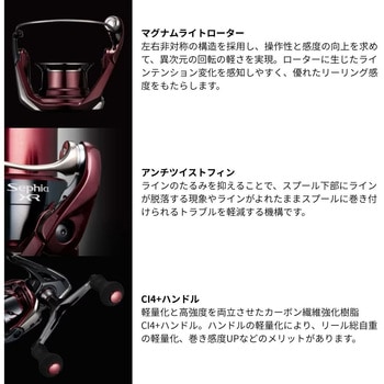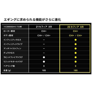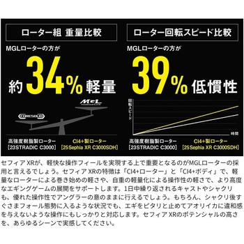 エギングゲームにおいて、リールが果たす役割は非常に大きく、また求められる性能も他の釣種とは異なる部分が多い。セフィアXRはエギを繊細にコントロールするための操作性、素早く糸フケを回収するためのレスポンス性能、C3000サイズでは大型のアオリイカとのファイトで必要なドラグ調整のしやすさやドラグの滑らかさなどを完備。さらにパワフルな巻き上げを実現したインフィニティドライブ、ギアの耐久性を向上させたインフィニティクロス、ラインローラー周りのトラブルを抑制するアンチツイストフィンの先進テクノロジーも搭載。ラインナップはライトエギングにマッチした小型軽量のC2000Sを含む全5機種。動のシャクリ、静のフォール、力のファイト、あらゆるシーンで操作する歓びを実感できる専用リールとして仕上がっています。